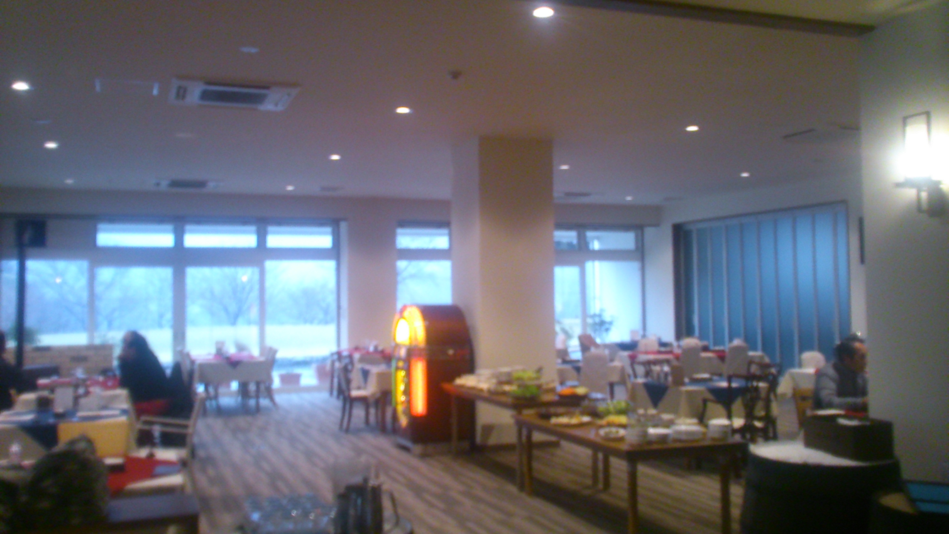 中央にレトロなミュージックボックスがあり、テラス席もあります。