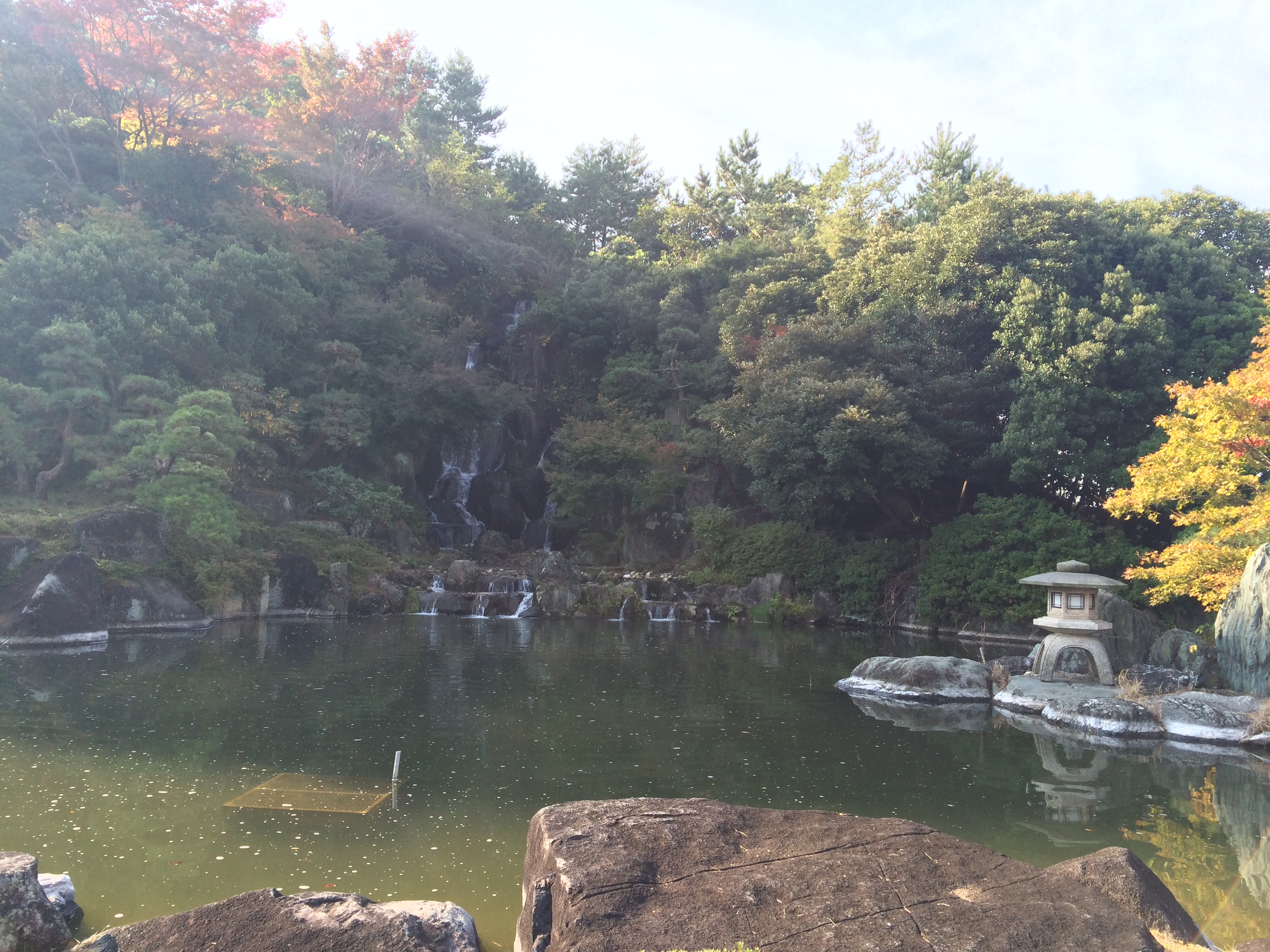 レストラン前の趣ある滝を眺めながら本日のラウンドシュミレーション。