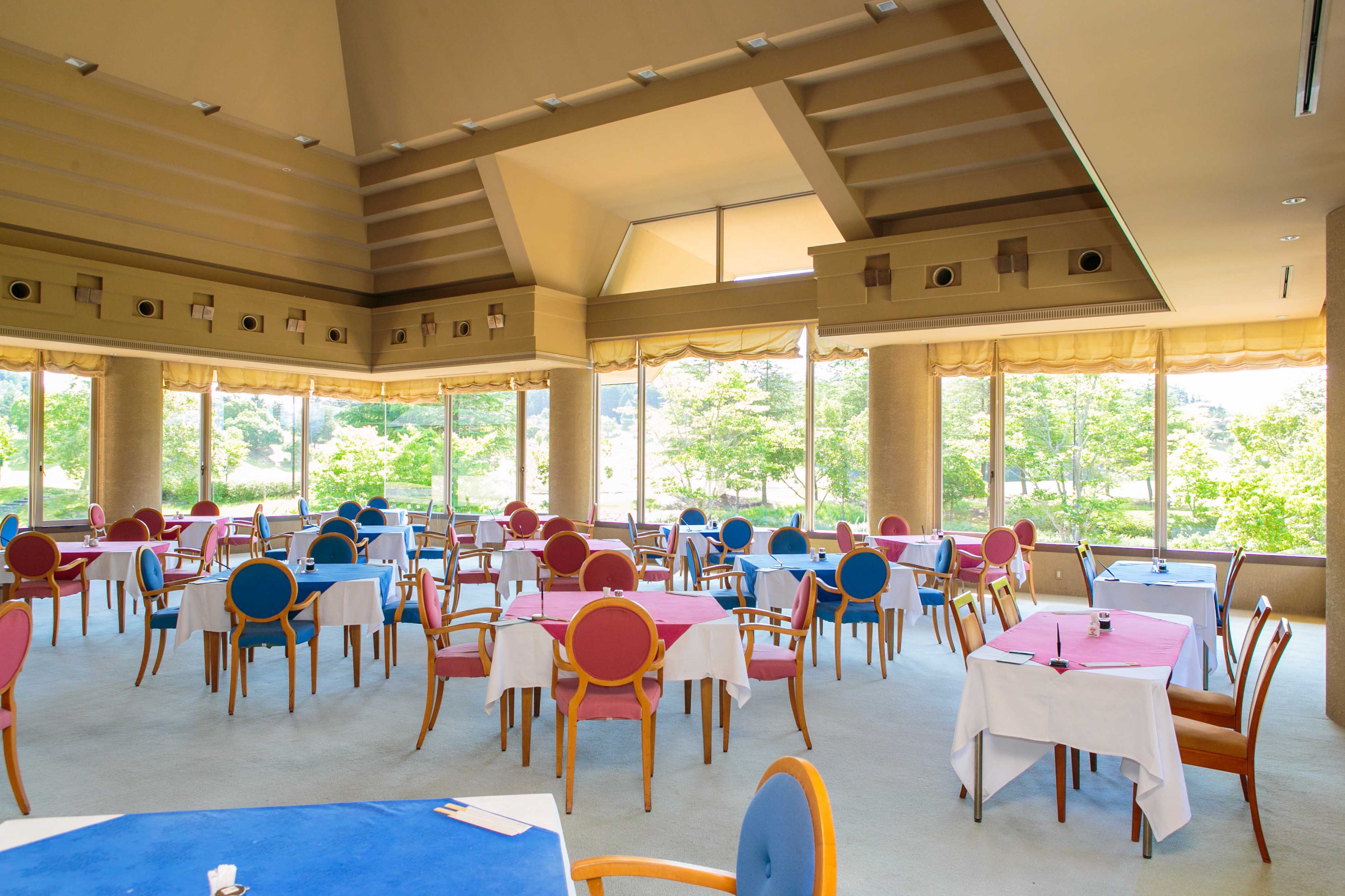 レストランも天井が高く、3面窓に囲まれた空間は開放的で寛ぐことができます!