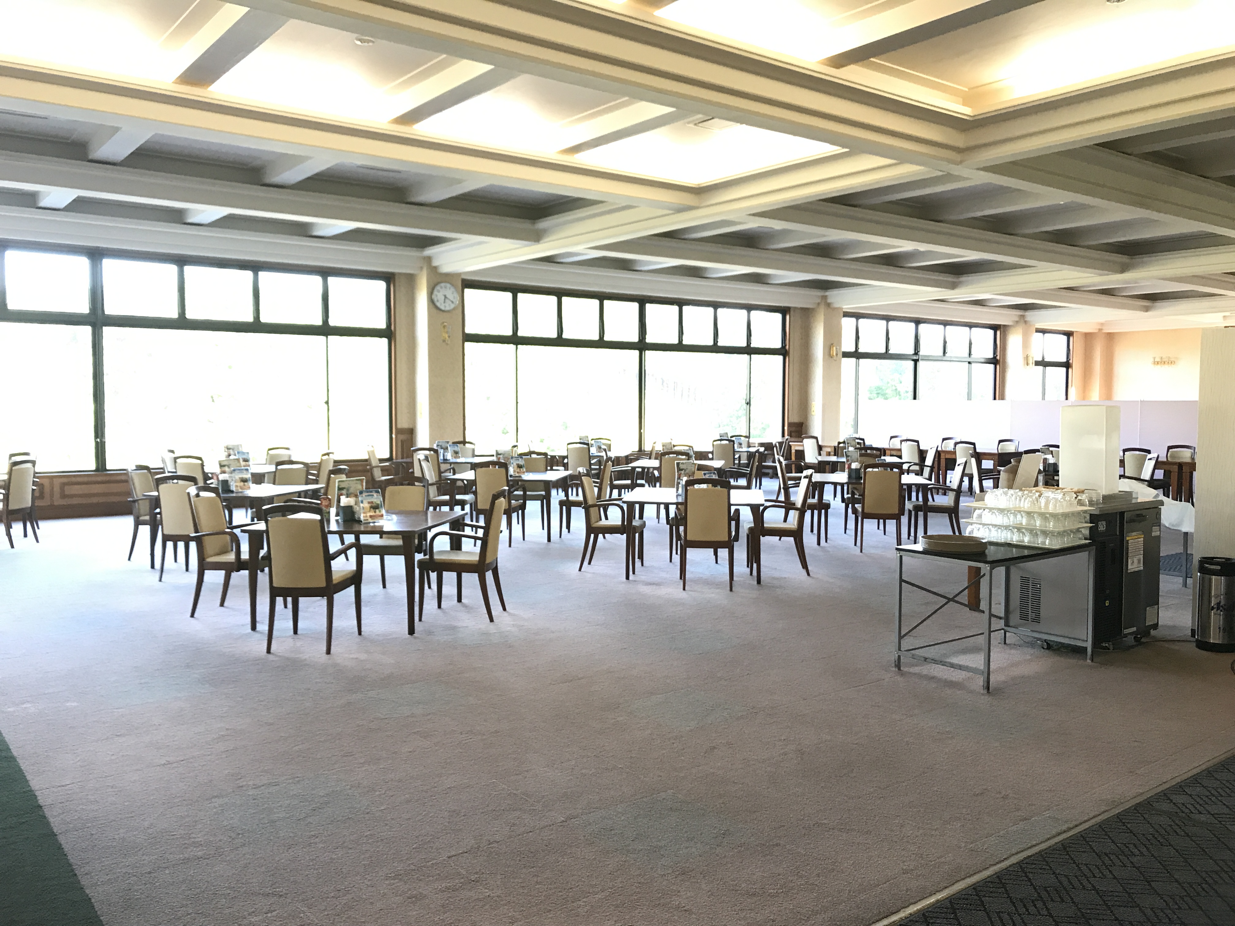 高い天井が印象的なレストランホール。ご朝食、ご昼食やプレー後のご休憩に・ご利用くださいませ。